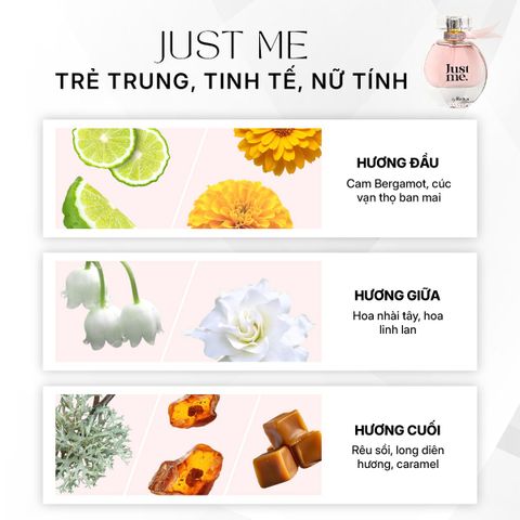 "Just me mùi hương toát lên một sự tinh tế và sắc sảo đầy cuốn hút. Từ những nốt hương ngọt ngào của đường tự nhiên, hương bung tỏa ra, mang đến hình ảnh những bông cúc cam đỏ rực rỡ, lạ lẫm và quyến rũ. Hương thơm mang đến một tổng thể vô cùng hấp dẫn, không quá nồng nàn hay ngọt ngào, phù hợp với nhiều lứa tuổi và mọi thời điểm"