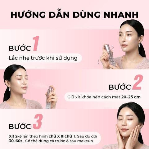 Bước 3: Xịt 2-3 lần theo hình chữ X & chữ T. Sau đó đợi 30-60s. Có thể dùng cả trước và sau makeup.